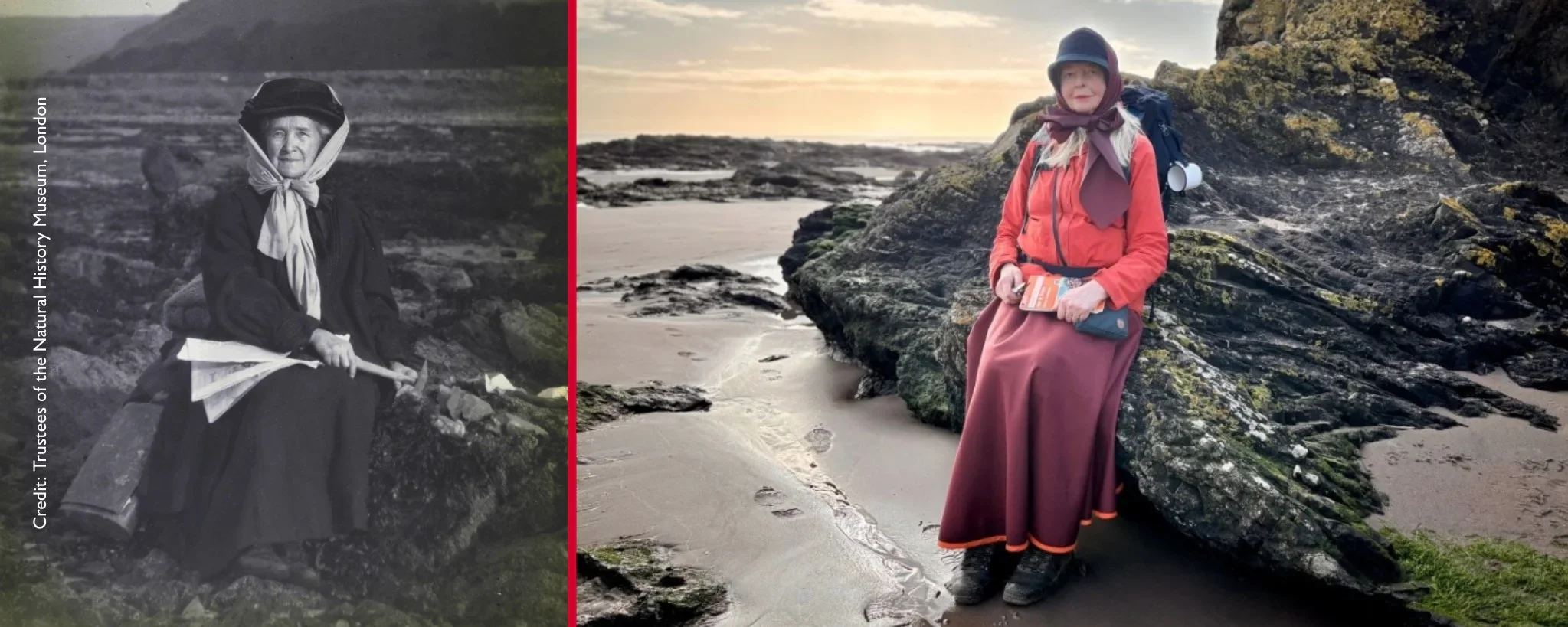 Walking in her footsteps, artist Claudia Zeiske follows Elizabeth Gray’s spirit of fieldwork — though her long skirt is made of Gore-Tex rather than Victorian cloth. Instead of searching for ancient fossils, Claudia is gathering what lies at our feet now next to stones of different shades of grey: colourful remnants of fossil-fuel culture. Materials that may one day form a new geological layer — the trace of our own age, a possible “Plastocene”**